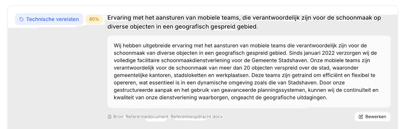 De agent herkent vergelijkbare vragen uit eerdere tenders en stelt passende antwoorden voor, gebaseerd op jouw bedrijfsinformatie. Je kunt direct feedback geven en alles aanpassen in je document