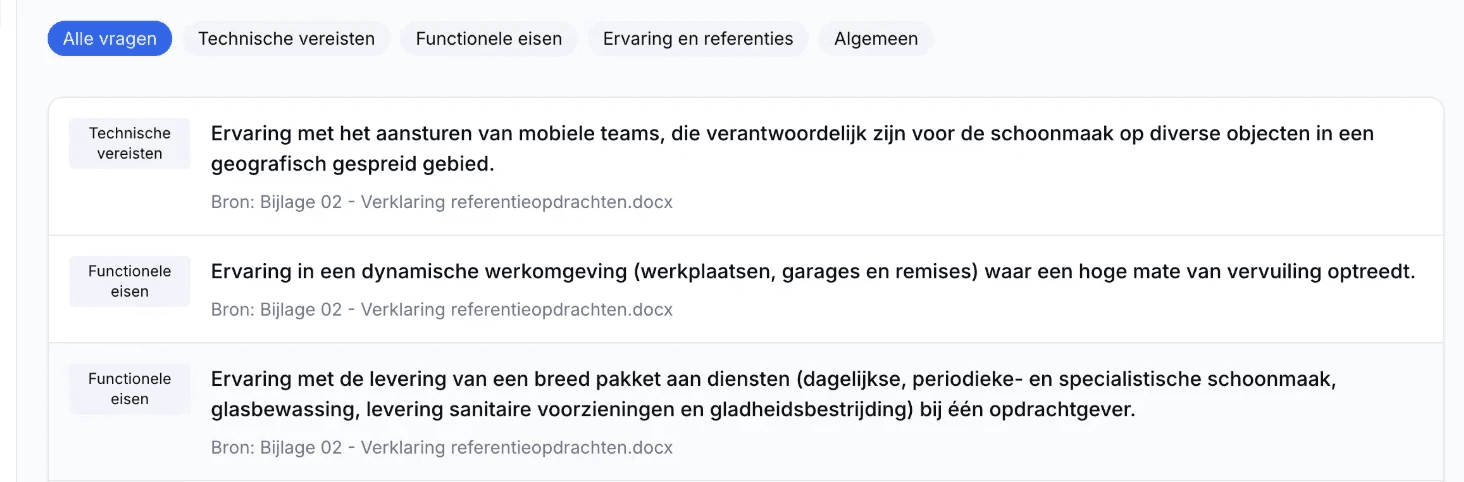 Vastgelopen op een complexe eis van een specialist? Krijg direct heldere antwoorden en strategisch advies van uw AI-assistent, die de volledige context van uw tender begrijpt