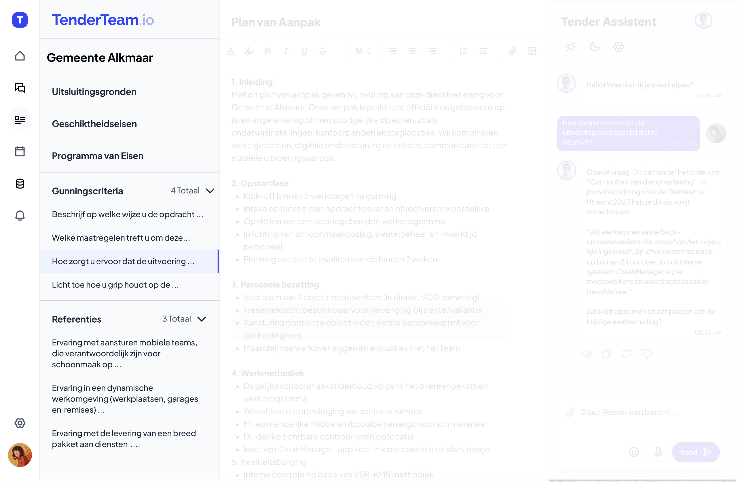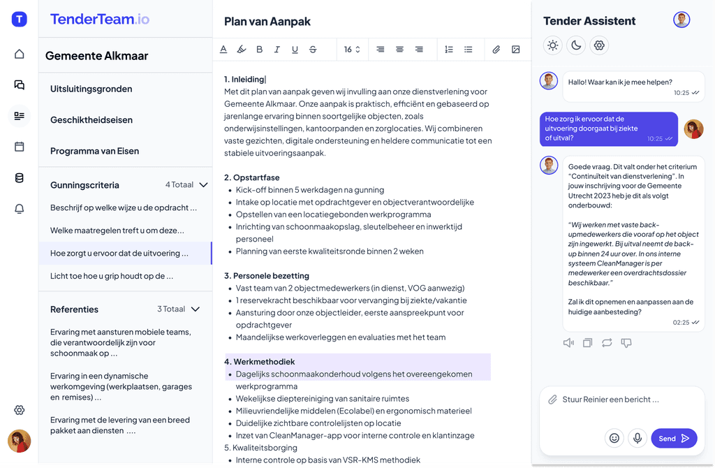 TenderTeam is de AI-partner die proactief meeschrijft, gebaseerd op de beste kennis uit uw eigen organisatie