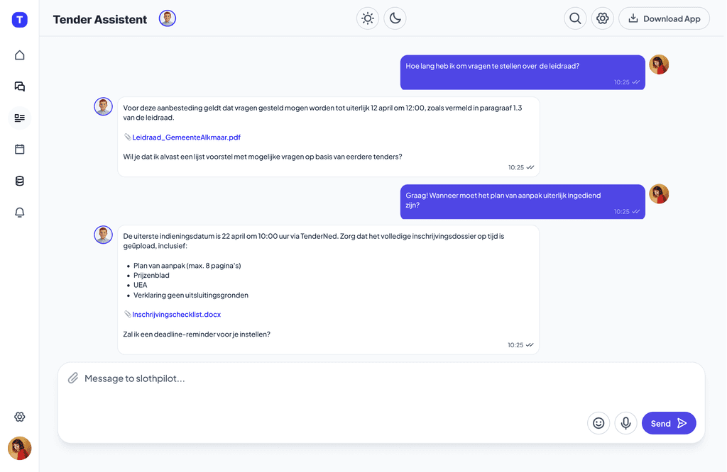 Stel vragen over planning, aanpak of procedure. De agent beantwoordt direct — op basis van aanbestedingservaring én jouw bedrijfsinformatie